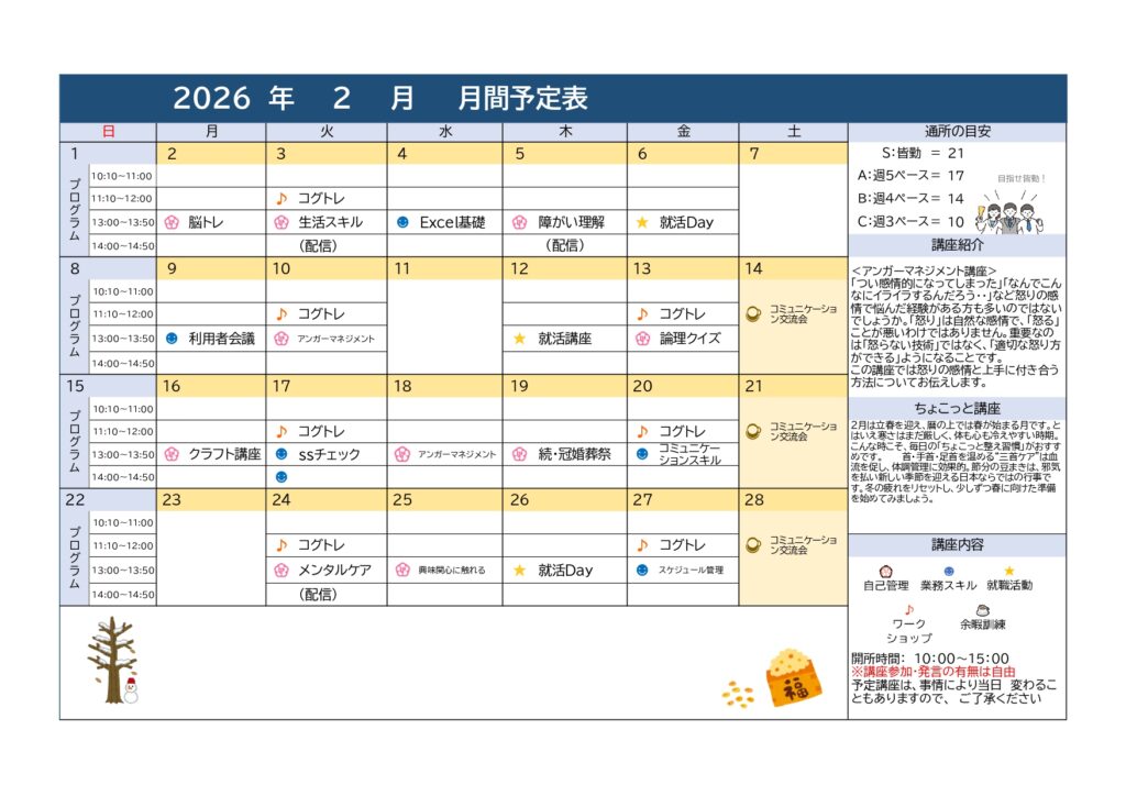 | プログラム提供時間 | ▼営業日 月曜日から土曜日まで。12月30日から1月3日は年末年始休暇をいただいております。 ▼営業時間 午前9時30分から午後6時まで。 ▼サービス提供時間 (プログラム・施設外活動等を含む) 月曜日から土曜日まで。午前10時から午後3時まで。 |