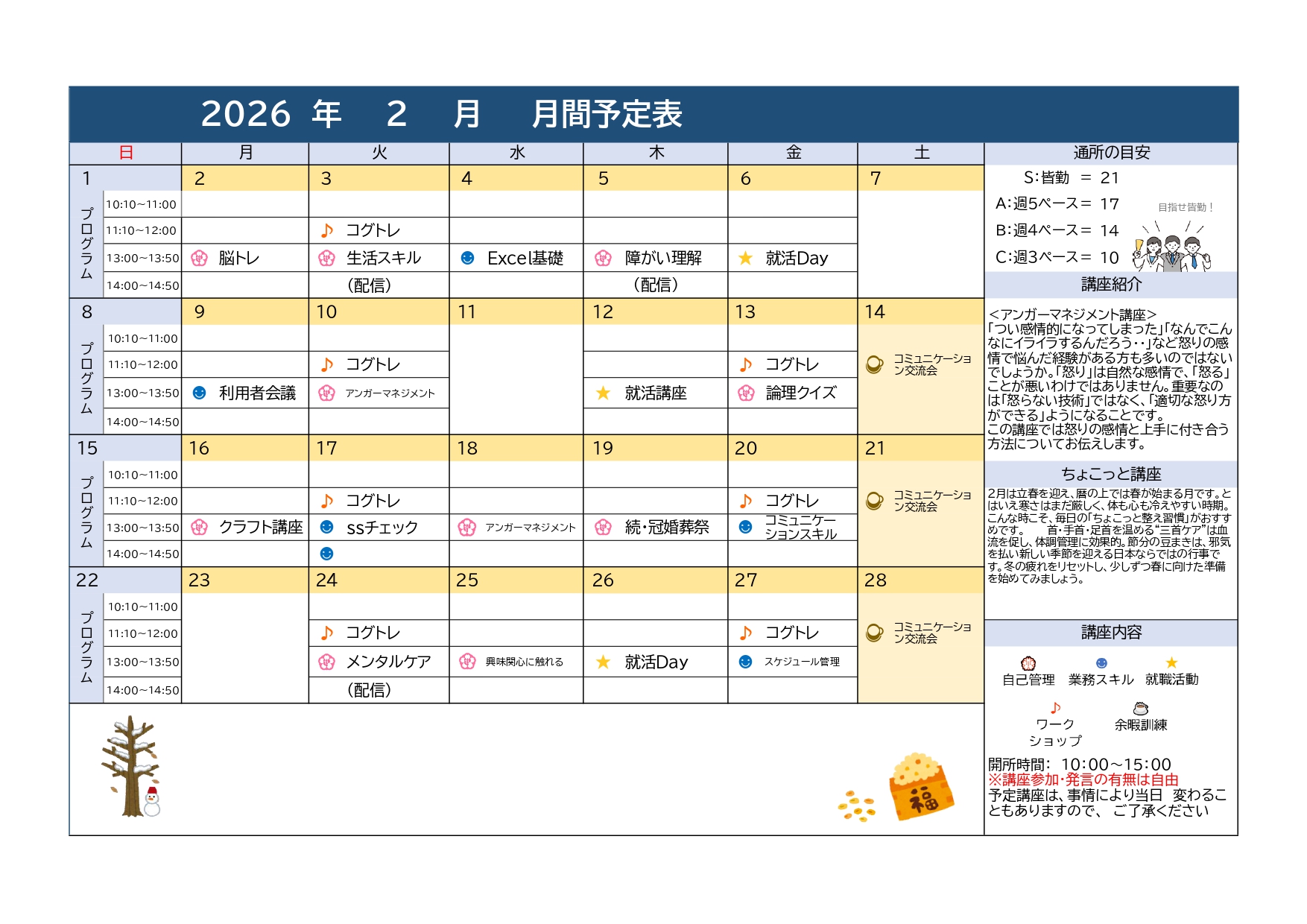 | プログラム提供時間 | ▼営業日 月曜日から土曜日まで。12月30日から1月3日は年末年始休暇をいただいております。 ▼営業時間 午前9時30分から午後6時まで。 ▼サービス提供時間 (プログラム・施設外活動等を含む) 月曜日から土曜日まで。午前10時から午後3時まで。 |