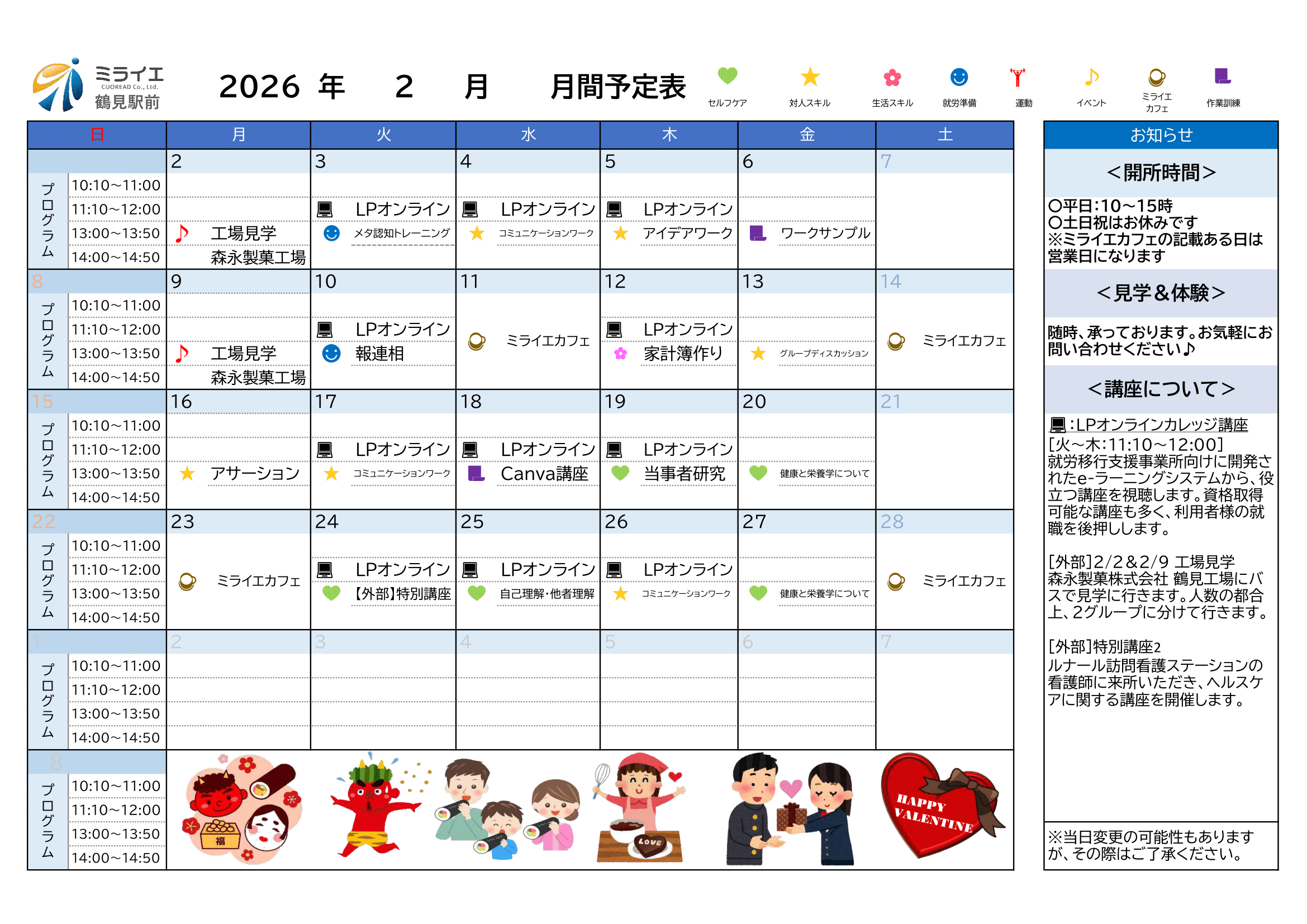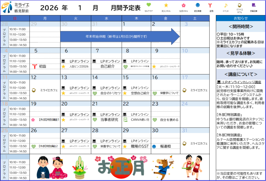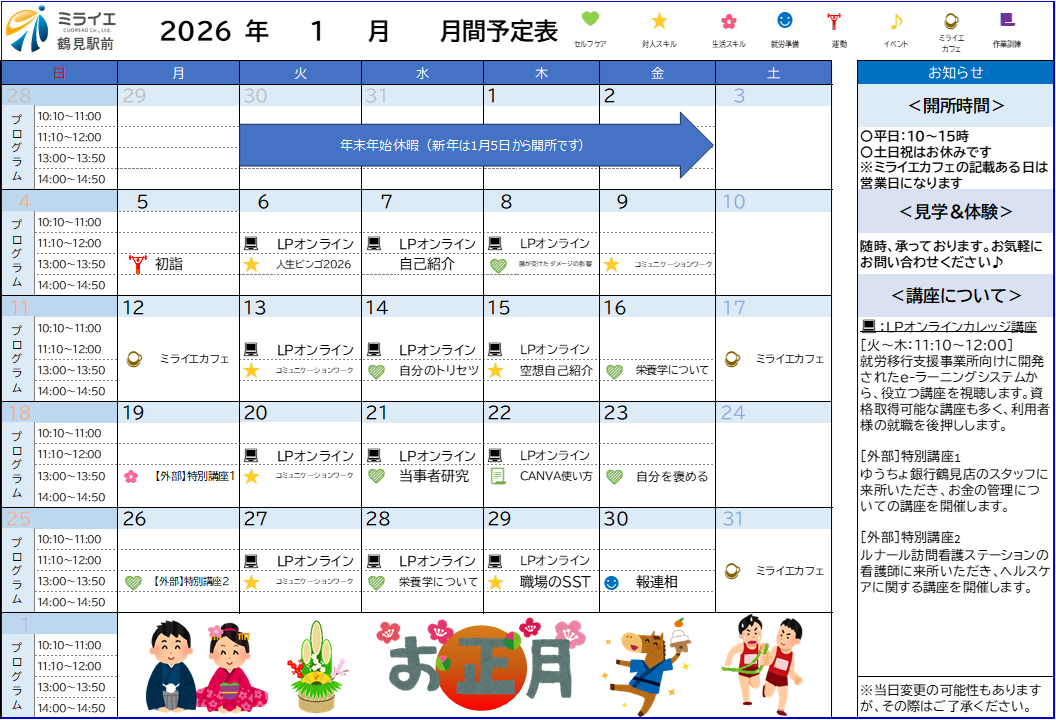 | プログラム提供時間 | ▼営業日 月曜日から金曜日まで。ただし、12月30日から1月3日までを除く。 ▼営業時間 午前9時30分から午後6時まで。 ▼サービス提供時間 (プログラム・施設外活動等を含む)月曜日から土曜日まで。午前10時から午後3時まで。ただし、12月30日から1月3日までを除く。 |